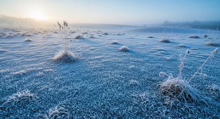 In the early morning light, a frost-covered field stretches into the horizon. The delicate crystals on the grass glimmer, creating a magical winter atmosphere.