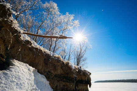 Frozen shore of the Ob river on a bright Sunny day.
