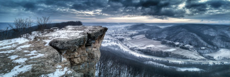 A stunning view from a snow-laden cliff reveals a vast valley below, rolling hills in the distance, and an overcast sky at dawn.