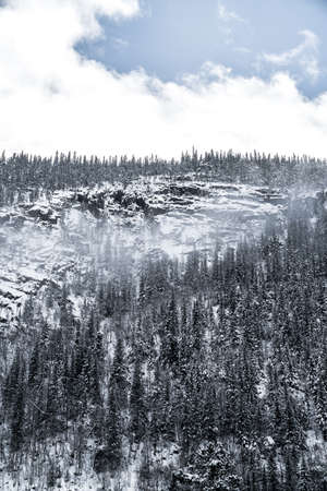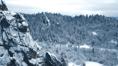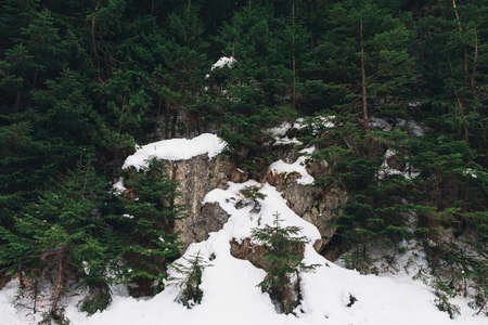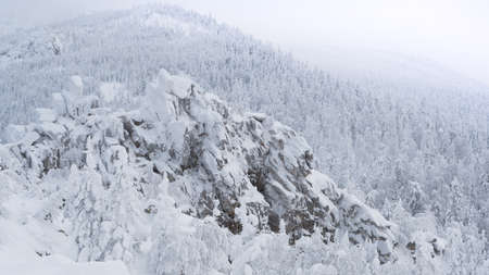 Winter landscape with snow covered rock cliff on slope. Coniferous forest after snowstorm. Wood in ice, branches became fluffy from frost. Hill is covered with firs like white carpet.