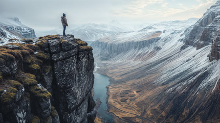 A lone man stands on a cliff, gazing out over a vast mountain valley, surrounded by snow-dusted peaks and dramatic scenery.