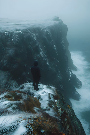 Moody Snow Covered Cliff Face Overlooking a Foggy Nordic Sea, Minimalist Icelandic Landscape
