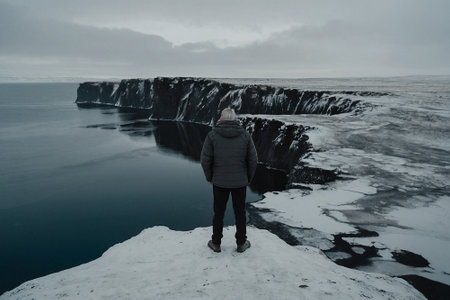 Icelandic seascape with a man standing on a rock in winter