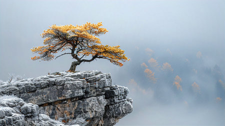 Majestic Solitary Tree on Steep Cliffs Surrounded by Dense Fog, Capturing Nature s Tranquil Beauty