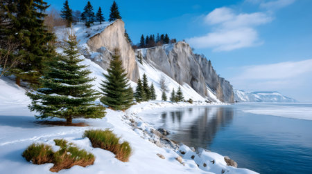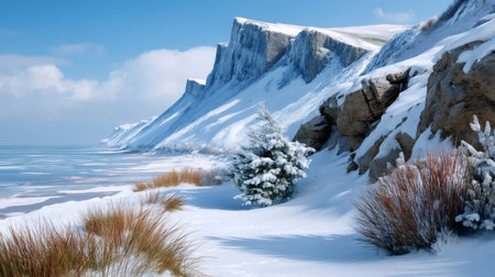 Winter landscape with snow covering beach and coastal cliffs