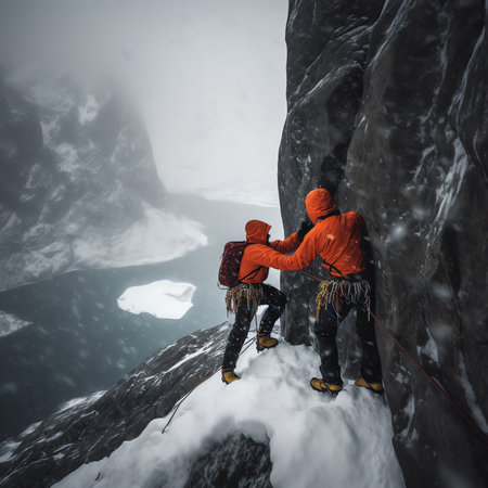 Generative AI : Tied climbers climbing mountain with snow field tied with a rope with ice axes and helmets
