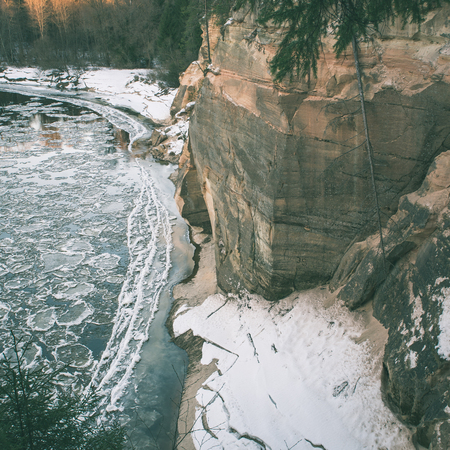 frozen river in winter with sandstone cliffs and ice blocks. Gauja National Park. Latvia. - instant vintage square photo