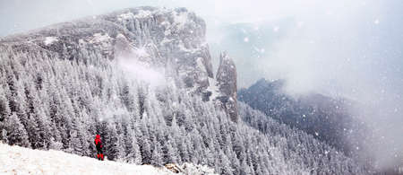 Winter landscape with a pine tree on the mountain. Beautiful snow-covered pine tree on the edge of the cliff. Trees are higher than clouds. Mountain landscape. Crimean pine with long needles.