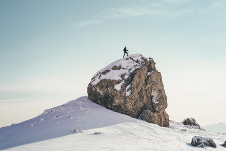 A person ascends a lone rock surrounded by untouched snow, capturing the beauty of solitude and determination in a minimalist setting.