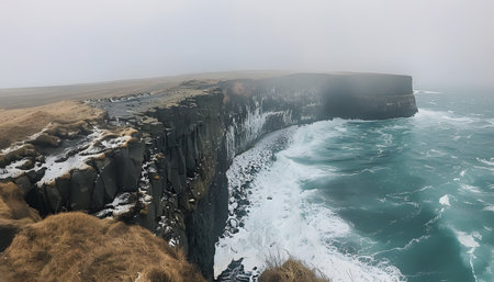 Sheer Snowy Cliff Faces Overlooking Foggy Nordic Sea, Dramatic Coastal Landscape, Iceland