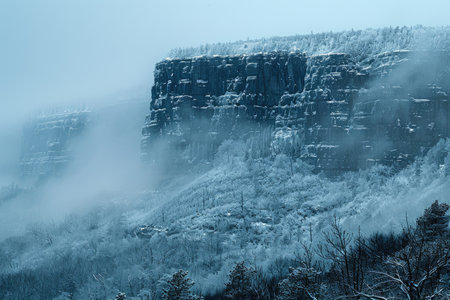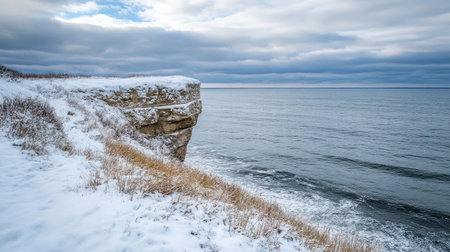 Cliff edge dusted with snow under a dramatic winter sky and icy landscape