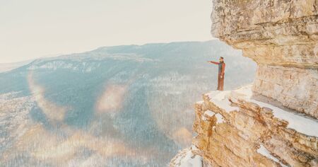 Explorer young man standing on high cliff Eagle shelf and pointing into the distance in winter, Mezmay, Russia. Image with sunlight effect.