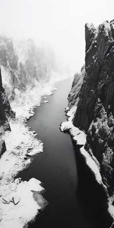 a black and white photograph captures a snow-covered river, reminiscent of iconic rock and roll imagery. the image showcases simplicity and a monochromatic color palette, with realistic hyper-detail. taken from a birds-eye-view, the photograph showcases mountainous vistas and atmospheric color washes, resembling a matte painting. ai generated