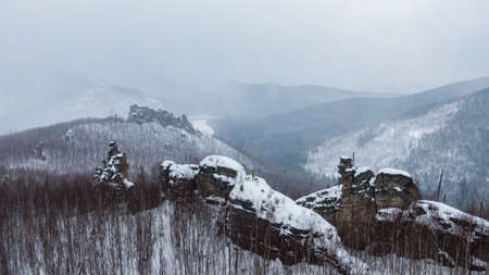 Landscape of Siberia mountains Stolbi, rock peak Takmak range in haze in winter