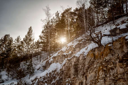 rocks in winter on the Anyui river. the rocks above the river. mansky pillars