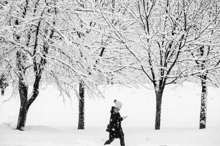 MOSCOW, RUSSIA - FEBRUARY 13, 2019: Girl walk in the park during a snowfall.