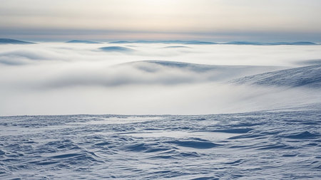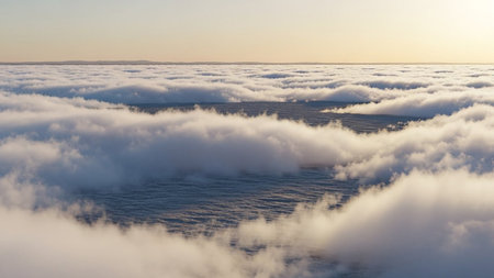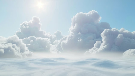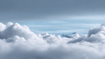 Vast expanse of soft white clouds against a pale blue sky, with a gentle light filtering through, creating a serene and ethereal atmosphere. The clouds are fluffy and layered, filling the entire image, and the landscape beneath resembles a snow-covered plain, adding to the overall peaceful and dreamy aesthetic. This image is perfect for commercial use in projects related to tranquility, peace, serenity, calmness, spirituality, and imagination, ideal for use in advertising campaigns or background images for websites or digital publications.
