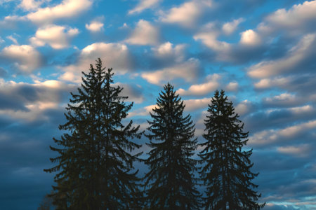 Three tall evergreen trees stand in silhouette against a backdrop of a partly cloudy sky, with soft, pastel-colored clouds dominating the scene.