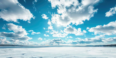 Frozen lake and blue sky with white clouds. Winter landscape.