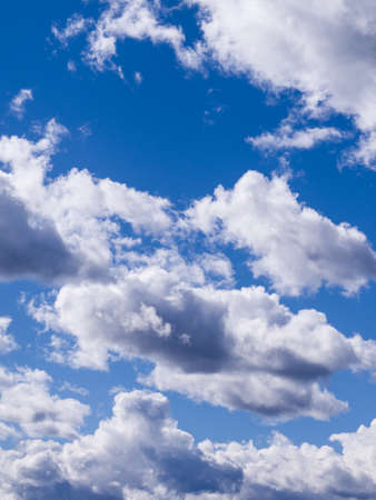 Stock showing bright blue sky filled with fluffy white cumulus clouds and some darker gray clouds casting shadows on a sunny day. resolution