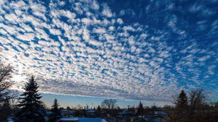 Bright winter day showcases a stunning sky with intricate cloud patterns celebrating the New Year in a tranquil snowy landscape.
