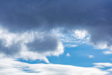 Blue sky with fluffy clouds on a windy day in spring. Abstract template with copy space