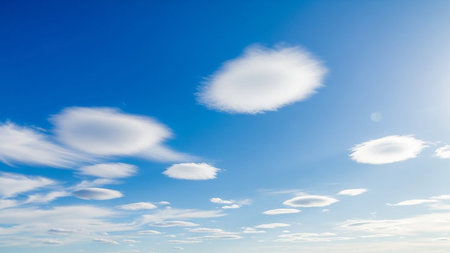 A vibrant blue sky is filled with numerous scattered white lenticular and wispy clouds under bright sunlight.