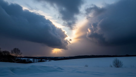 Beautiful winter landscape with snow covered field and dark stormy sky