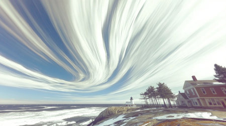 Windswept clouds above quiet beach town: serene skyline, coastal breeze, atmospheric detail, weather shifts, scenic twilight, nature's palette