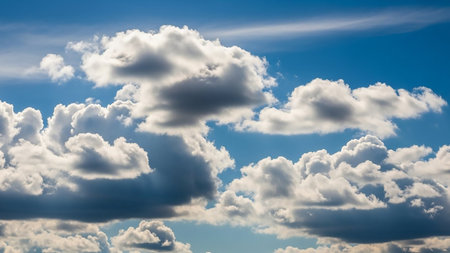 AI Generated. Fluffy white clouds over rich blue sky create soft and serene atmosphere