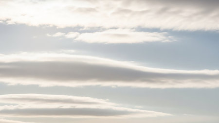 Layers of soft white and pale grey stratocumulus clouds illuminated by bright sunlight against a pale blue sky.