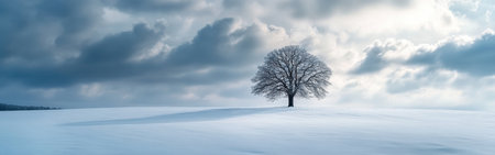 A solitary tree rises from a vast, untouched blanket of snow, casting a long shadow. Dark clouds swirl above, creating a moody and tranquil winter atmosphere.
