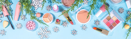 Winter make up set on light blue background, with artificial snowflakes and Christmas tree branches. Various makeup professional cosmetics - shadows, lipstick, mascara, blush. Christmas beauty sale