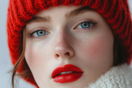 Close-up portrait of a very beautiful woman with a relaxed face in a knitted red hat and bright makeup, with red lipstick on her lips.