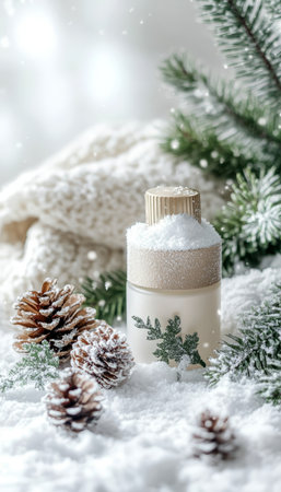 Pine branches frame skincare essentials in snowy theme.