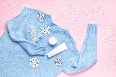 Stylish knitted sweater, cosmetic products and winter decor on color background