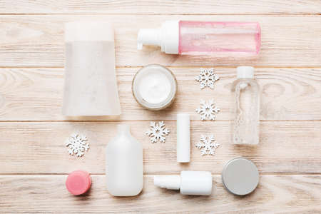 Winter care cosmetics on a colored background top view.