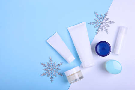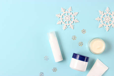 Winter Skin Care products and snowflakes on blue background, flat lay, copy space. Seasonal beauty routine and skin protective cosmetic for winter weather concept.