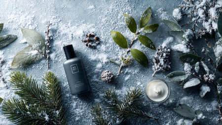 Winter skincare set arranged with icy tones and pine accents.