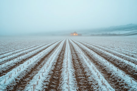 Agricultural field blanketed in snow, featuring organized rows that guide the eye toward a distant farmhouse glowing softly in the fog, creating a serene winter atmosphere