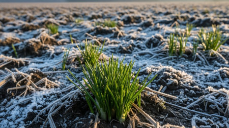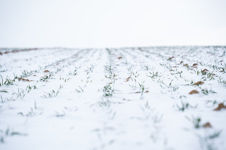 Sprouts of wheat under the snow in winter season. Growing grain crops in a cold season. Agriculture process with a crop cultures.