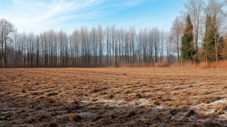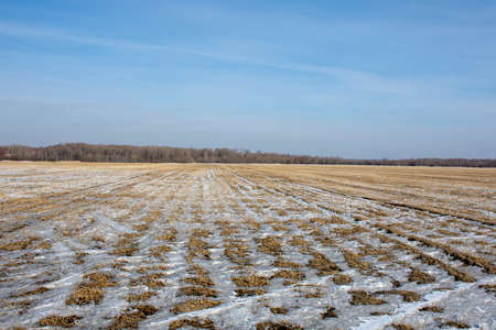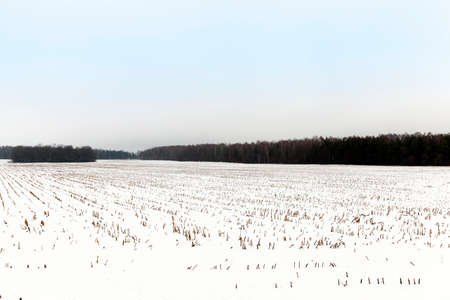 farm field photographed in winter, covered with snow from under the visible remnants of the maize plants after harvest, blue sky and the forest in the background