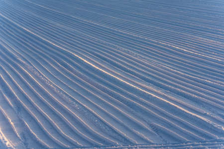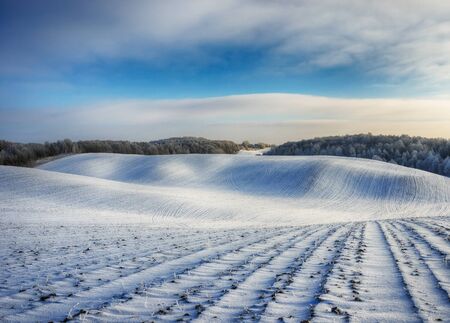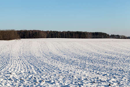 covered by snow plowed agricultural field with irregularities. Against the background of the blue sky and the forest.