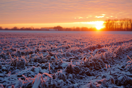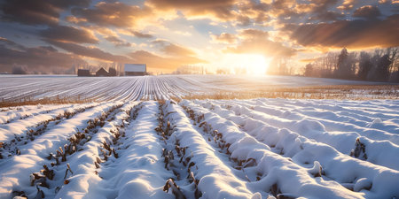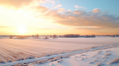 A serene winter scene showcasing a stunning sunrise over a snow-covered field, highlighting the soft golden light and the tranquil beauty of nature. Perfect for winter-themed imagery.
