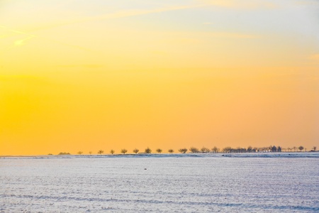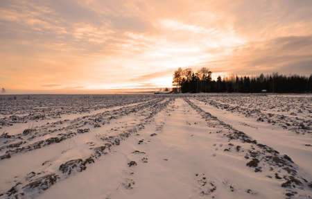 View of a sunset over a winterly landscape in a rural environment in Germany, Europe.