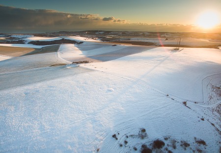Winter landscape with the sun setting over the horizon. The sun's rays are reflected in the white snow in the cornfield.