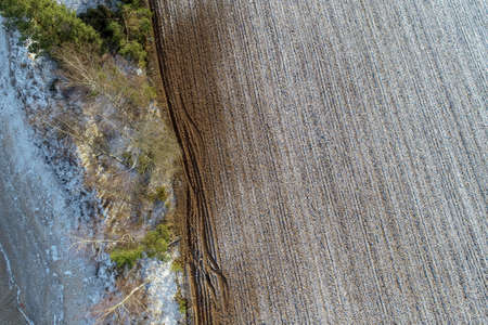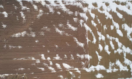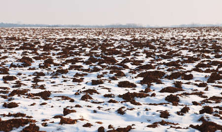 Large dug up plowed land or field for sowing grain or planting potatoes. Agriculture field with snow spots at sunset.