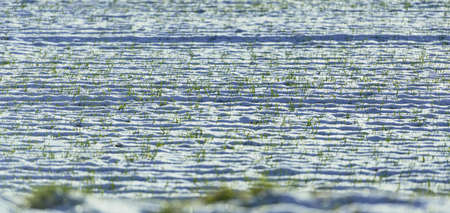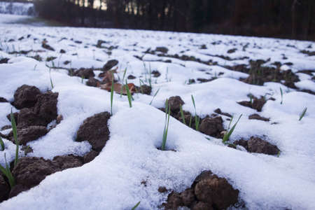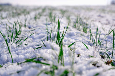 Sprouts of green winter wheat on a field covered with the first snow. Wheat field covered with snow in winter season