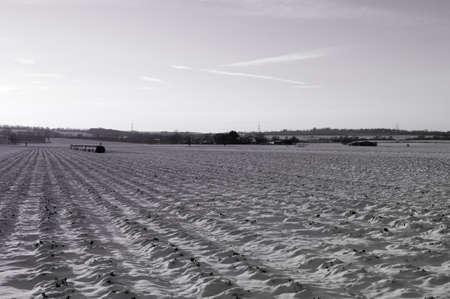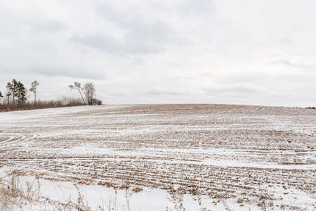 Plowed agricultural field covered with white snow, in the background trees covered with white rime in the forest