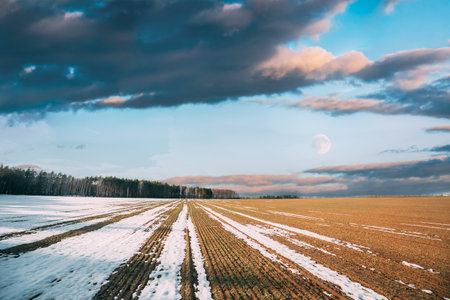 Spring Plowed Field Partly Covered Winter Melting Snow Ready For New Season. Ploughed Field In Early Spring. Farm, Agricultural Landscape Under Scenic Cloudy Sky.
